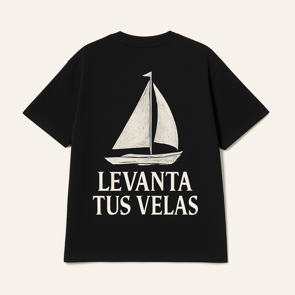 La camiseta representa ese acto de fe cotidiano: levantar las velas aun cuando no sabes hacia dónde soplará el viento. El diseño muestra movimiento, riesgo y libertad — la clase de libertad que se encuentra solo cuando decides avanzar con Dios como capitán.